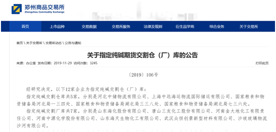 11月29日,鄭州商品交易所(以下簡稱鄭交所)發布《關于指定純堿期貨交割倉(廠)庫的公告》,河北中儲物流有限公司成為鄭交所指定純堿交割倉庫,自2020年4月1日起開展純堿期貨交割業務。